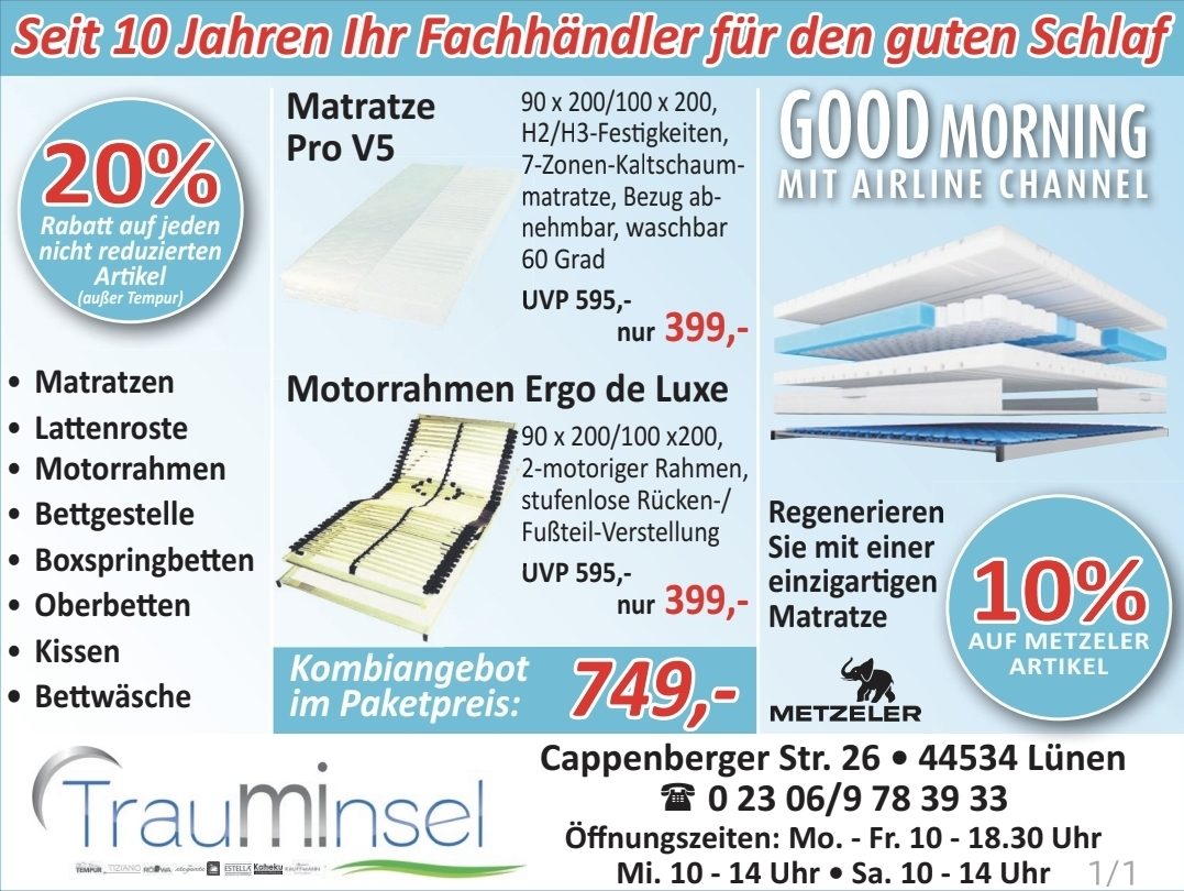 Wir finden das Ideale Bett für jeden einzelnen, und bieten Ihnen fachmännische Beratung, Markenvielfalt und faire Preise. Die Trauminsel führt Bettgestelle, Boxspringbetten, Matratzen, Bettwäsche, Weichwaren und Dekoration von ausgesuchten Herstellern. Eine hohe Serviceleistung, Beratungsqualität, Kundennähe und Nachhaltigkeit zeichnen uns aus. Besuchen Sie uns, Ihren Fachhandel für Schlafsysteme in Lünen, in der Cappenberger Straße 26.